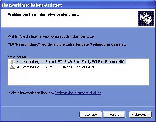 Nun wählen Sie das Gerät und die (bereits konfigurierte) Verbindung aus, mit dem Ihr Rechner mit dem Heimnetzwerk verbunden wird.