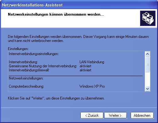 vorgegebenen Namen "MSHEIMNETZ" können Sie beliebig ändern. Das jetzt folgende Dialogfeld dient der Überprüfung der vorgenommenen Einstellungen, die Sie gegebenenfalls über die Schaltfläche "Zurück" nochmals ändern können. Die Bestätigung mit "Weiter" startet die Einrichtung des Netzwerks.